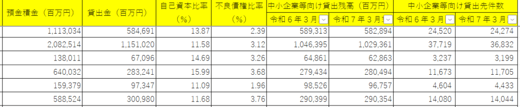 上記ポイントは金融庁の業態別(全国)の中小・地域金融機関情報一覧で確認できます。