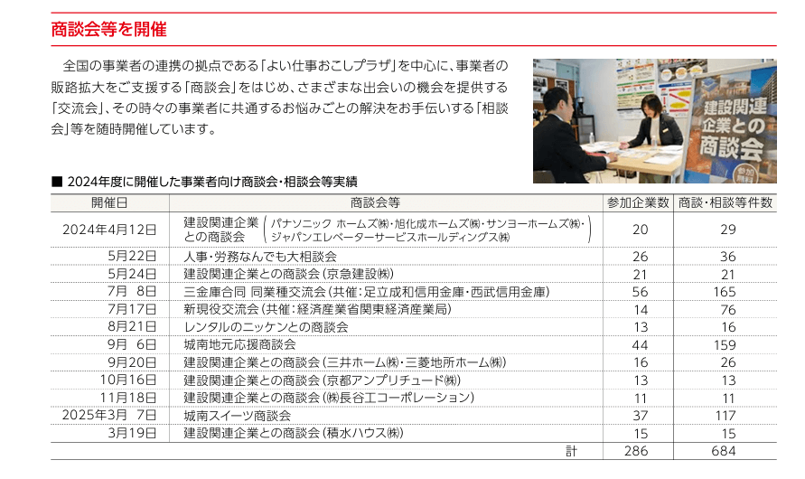 城南信用金庫のディスクロージャー内に商談会情報あり、三井ホーム、長谷工など建設関連の商談会を定期的に行っていることを発見。