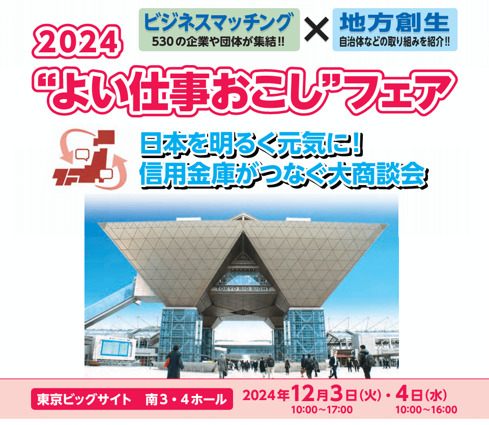城南信用金庫が主催するよい仕事おこしフェアは、全国250以上の信用金庫の取引先企業等が参加。2024年の開催は来場者数22,940人、商談数4,170件の大きなイベントとなりました。